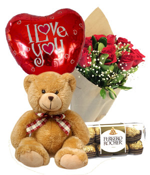 (6 Inch Bear, Ferrero Rocher Chocolates, 1 Single Rose, 6 Inch Heart Cushion)